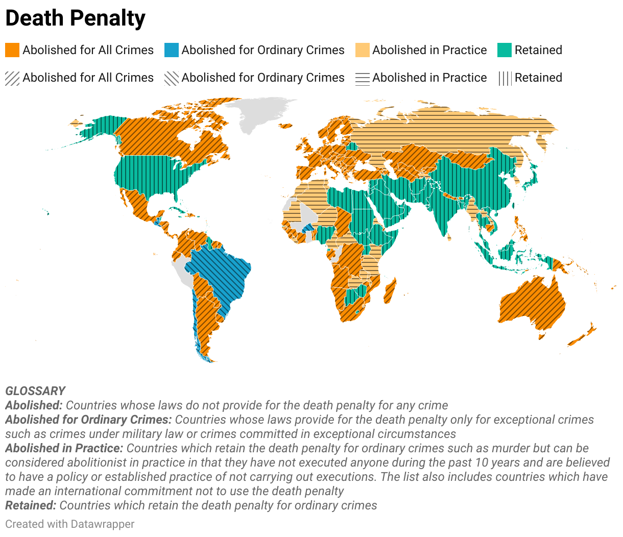 Based on 2021 data from the Death Penalty Information Center, 141 countries have abolished capital punishment in some capacity (i.e. totally, for ordinary crimes, or in practice), and 55 countries permit capital punishment. Current data also shows that there were 579 executions carried out in 2021 by 18 countries. Methods used included beheading, hanging, lethal injection, and shooting.